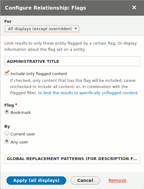 To show which user flagged the content we need another Relationship: User from the Flagging category that will automatically be set to use the first Flags Relationship. This new Relationship introduces user info into the Views, which means we can add a Field User: Name and set it to use the User Relationship which means it will show the “owner” of the Bookmark (as opposed to the author of that content, for example).