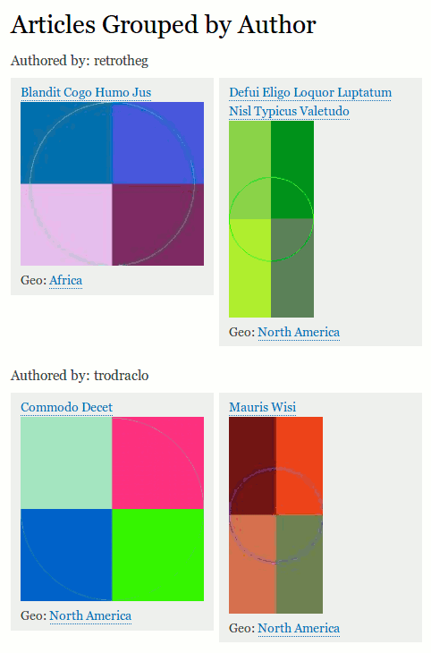 Here is an example of article information arranged in a grid and grouped by the author username: