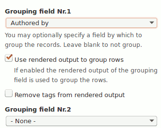 For example, if we have a table of Article nodes showing various information related to that node, we might want to group the results by the article Author. We would end up with as many groups as there are different Authors in the results.