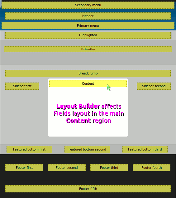 The “Layout Builder” name may sound generic and can confuse people into believing that it provides the interface to construct the layout for entire pages, which is not the case. Layout Builder can only affect the “main content” part of a Drupal page, it doesn't replace or control the theme regions.